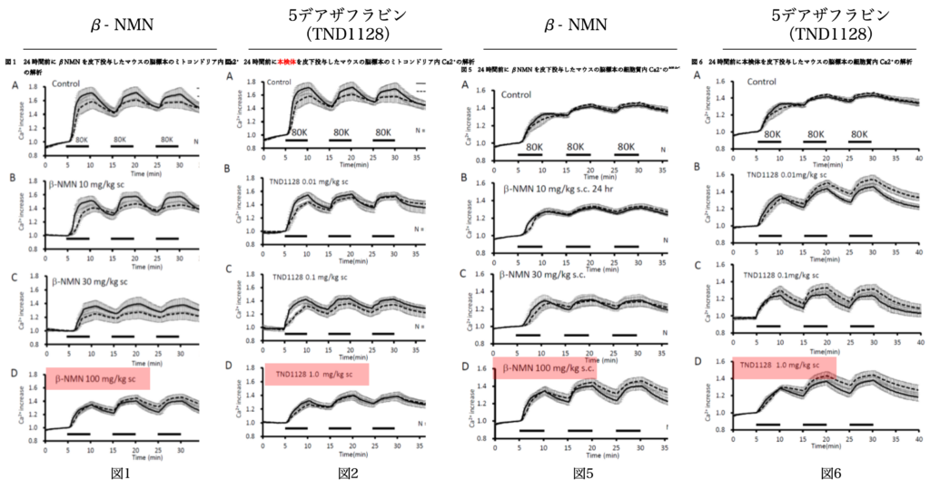 その結果、β-NMNおよび5デアザフラビンはどちらも、細胞質内のCa濃度およびミトコンドリア内のCa濃度を制御する作用を示しましたが、5デアザフラビンの方がその効果が100倍以上強力であることがわかりました。