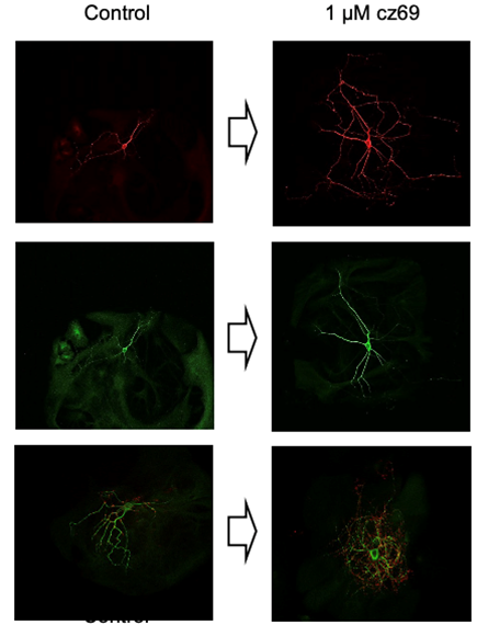 左はControl(対照群)、培養1日目にDeazaflavin(1 μM)を 1回のみ添加した神経細胞を示す。