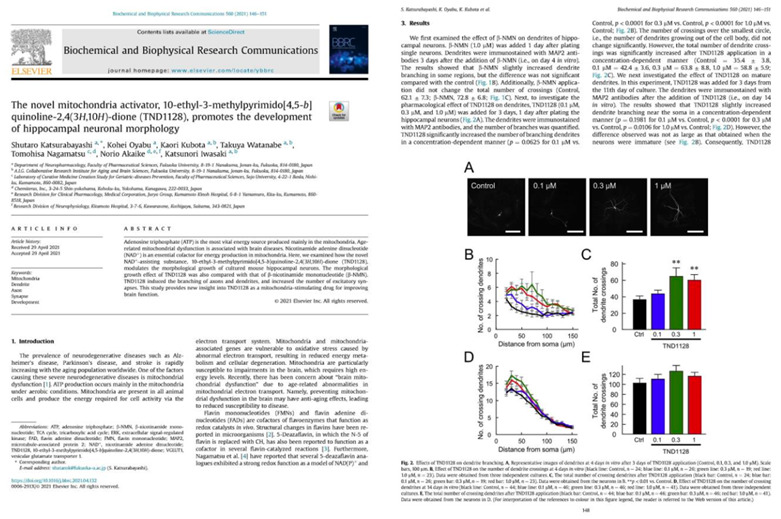 論文:The novel mitochondria activator, 10-ethyl-3-methylpyrimido[4,5-b]quinoline-2,4(3H,10H)-dione (TND1128), promotes the development of hippocampal neuronal morphology