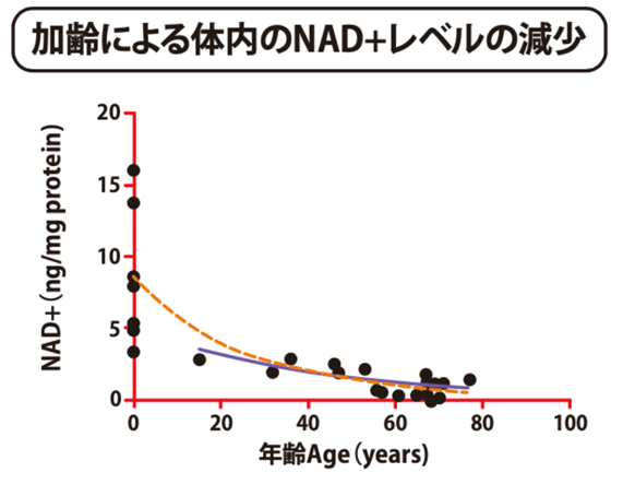 鍵を握るのは、NAD(ニコチンアミドアデニンジヌクレオチド)という物質です。NADは、細胞内のミトコンドリアにおけるエネルギーの産出に欠かせない補酵素で、サーチュインを活性化させる役割を担うとされています。組織中のNAD量は加齢と共に減少しますが、NADを増やすことができれば、サーチュインを活性化させ老化を遅らせる効果を期待できます。