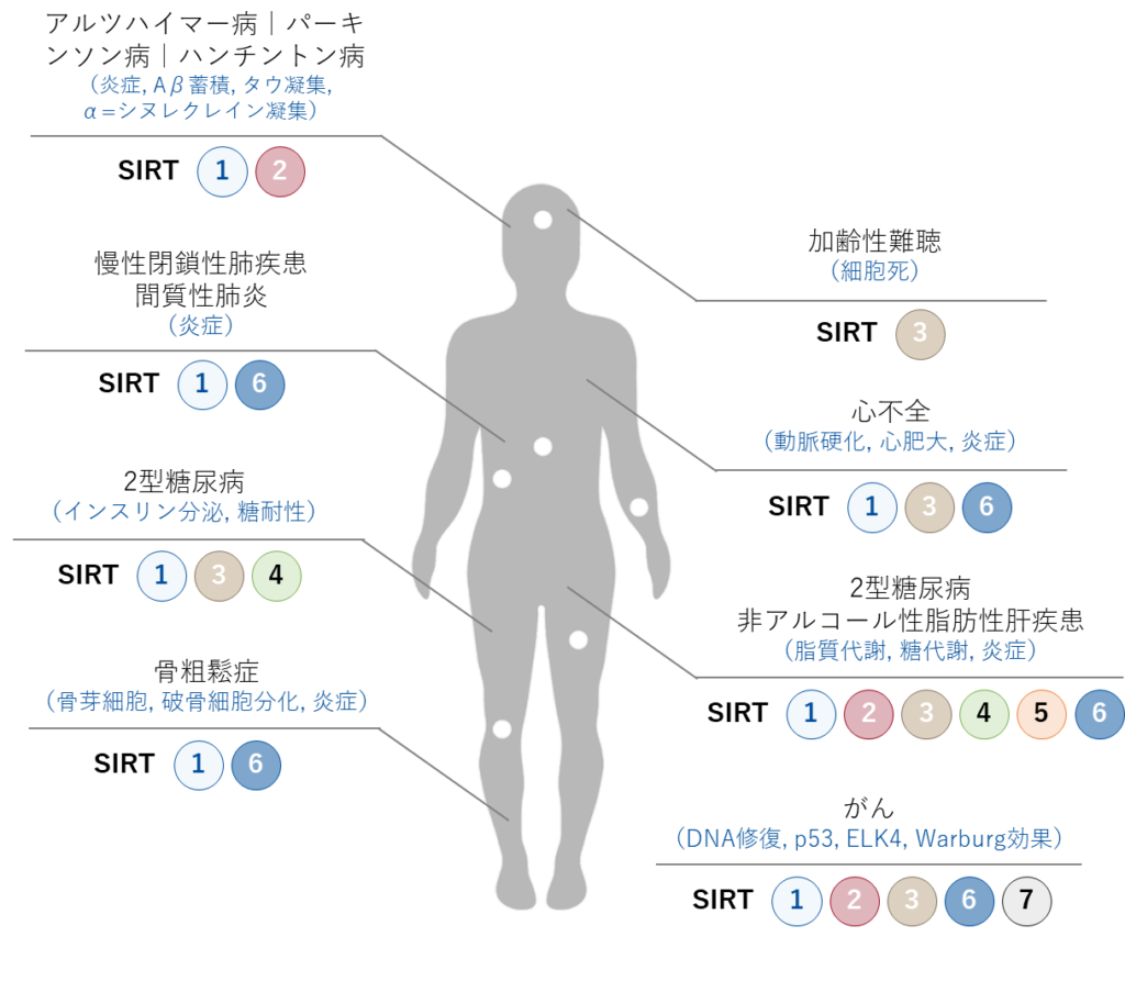 サーチュイン遺伝子SIRT1〜7との関連が報告されている老化関連疾患は、実に多く存在しています。サーチュイン遺伝子を活性化させることで、これらの疾患の改善効果が期待されています。